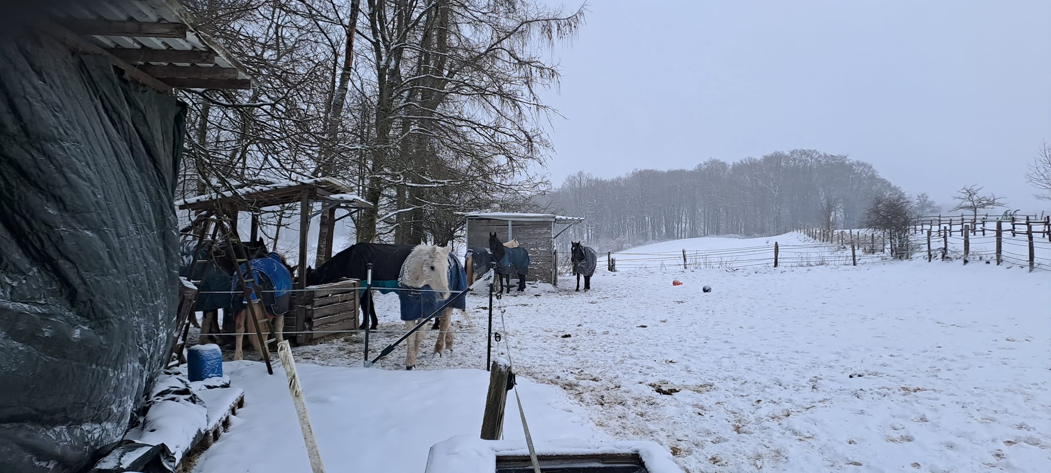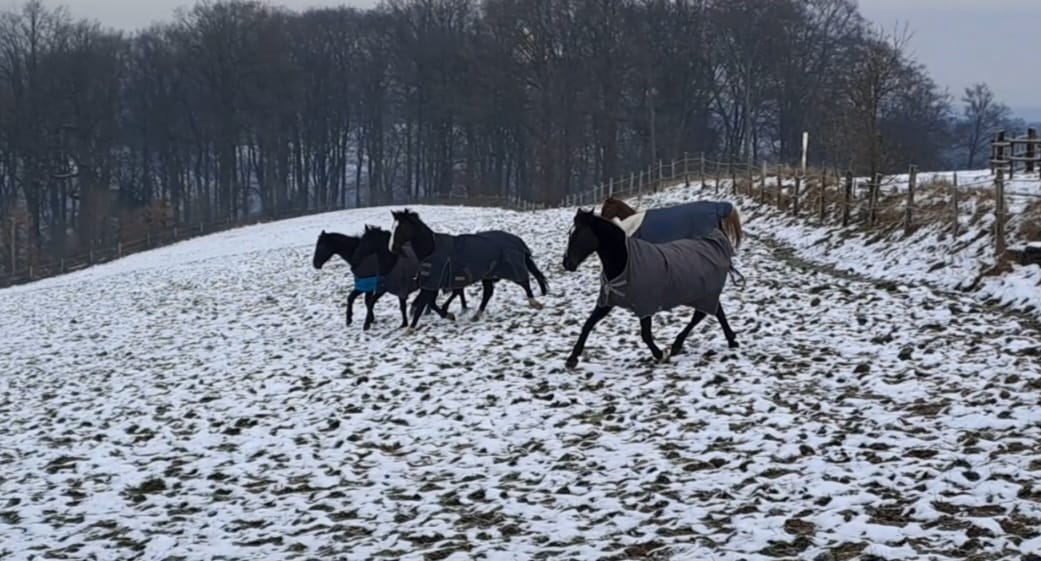 Bei uns ist es so richtig Winter. Tage mit ordentlich Schnee, dann taut es wieder um neu zu frieren. Heute morgen war unser Paddock stellenweise spiegelglatt, daher haben wir kurzentschlossen die Wiese offen gemacht. Dort können die Jungs deutlich besser laufen und genießen es endlich mal wieder richtig toben und rennen zu können.
