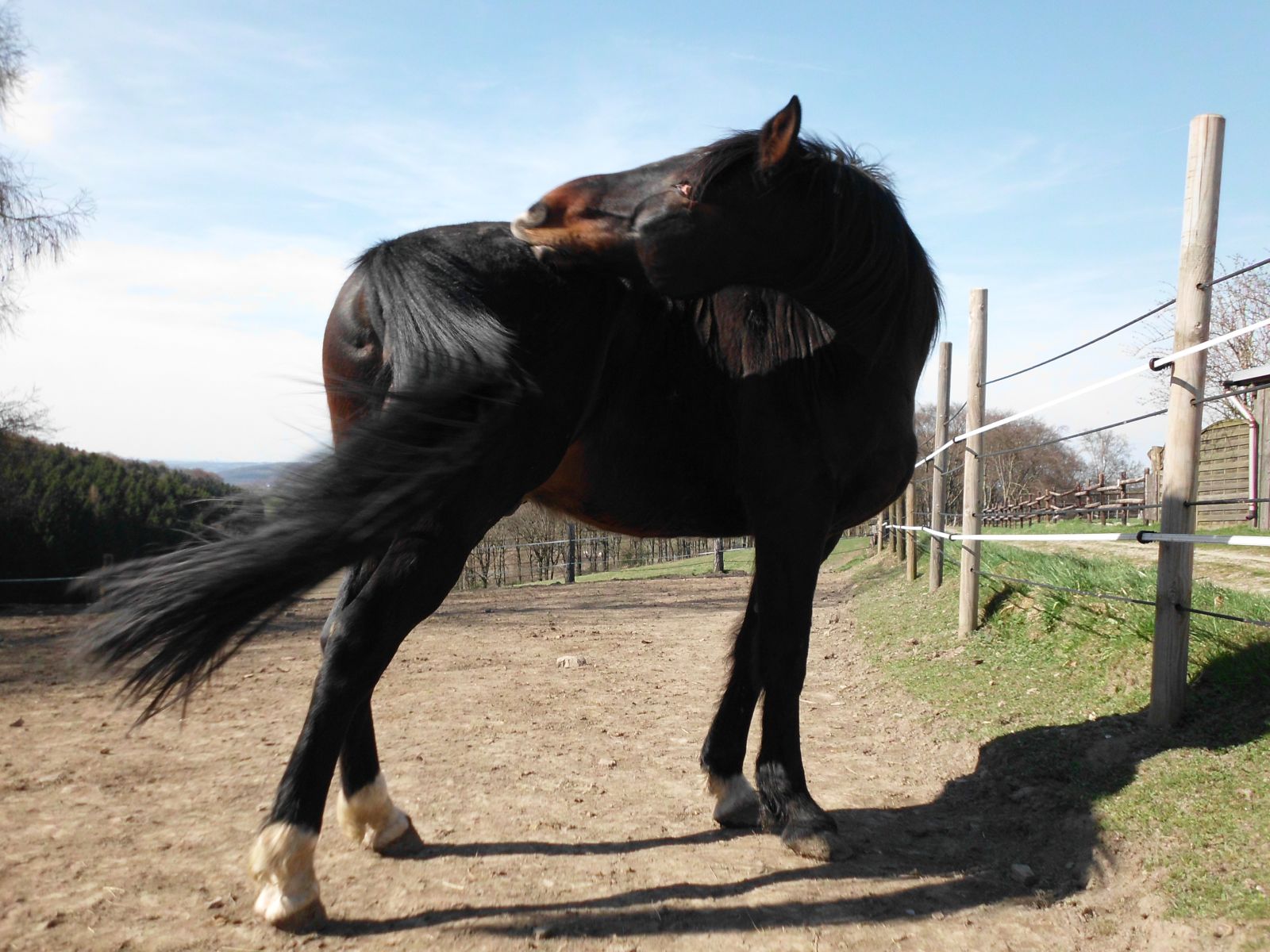 Pferd Nummer 7, der 21-jährige Westfalenwallach "Picasso" ist nun auch Mitglied in unserer Männer-WG. Keine 5 Minuten im Paddock und schon spielte er mit seinem neuen Kumpel Mr. Tiv und wälzte sich ausgiebig! Er verstand sich mit allen Pferden auf Anhieb prächtig und fühlt sich dem Anschein nach schon ausgesprochen wohl in seinem neuen Zuhause!