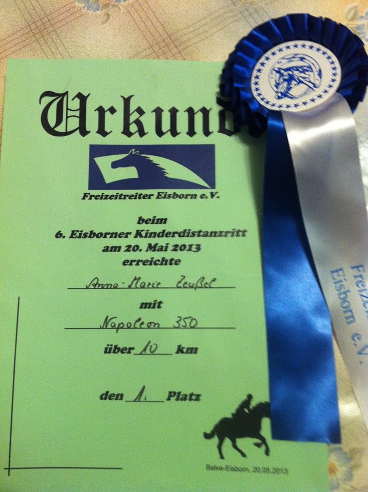 Heute war der vereinsinterne Distanzritt der Freizeitreiter Eisborn. Katharina mit Ramiro und Barbara mit Midar nahmen spontan daran teil. Mit Erfolg... belohnt wurde das Unterfangen mit einem 1. Platz für Barbara und Midar. Katharina belegte mit Ramiro den 6. Platz. Leider gibt es hierzu keine Fotos, daher hier noch ein paar Bilder vom 28.09.2013. :)