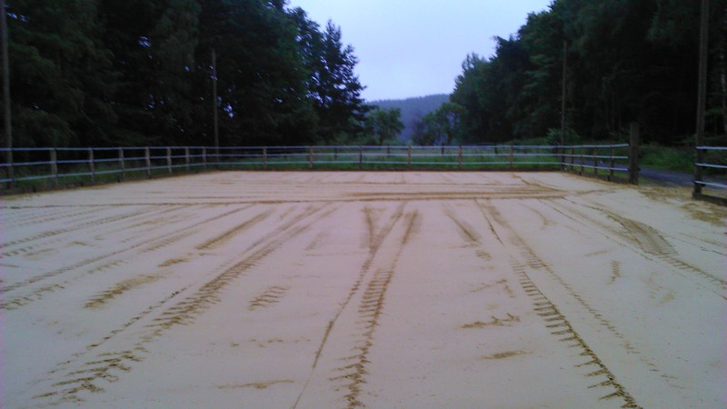 Unser Reitplatz ist fertig! Die Beleuchtung fehlt zwar noch, aber wir können schonmal die Pferde darauf bewegen. :)